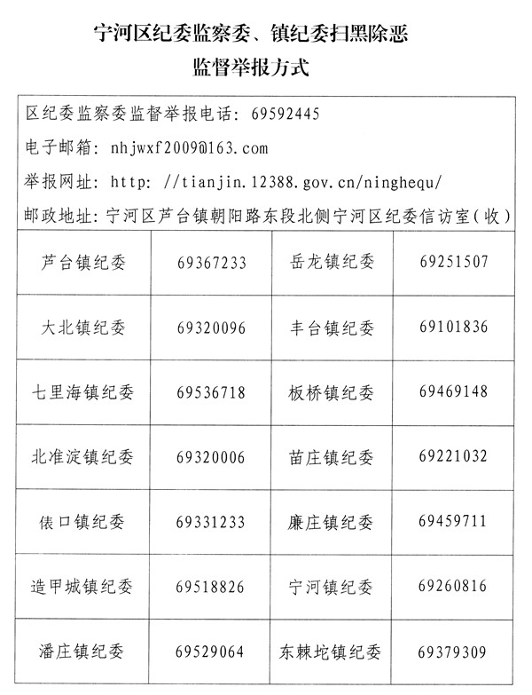 按照天津市纪委工作要求,根据区委统一部署,自2018年3月起,宁河区纪委在全区范围内开展扫黑除恶专项斗争监督执纪问责工作,现将有关事项公告如下: