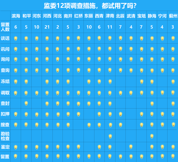 深化国家监察体制改革是以习近平同志为核心的党中央作出的重大决策部署,是事关全局的重大政治体制改革。《中华人民共和国监察法》赋予监察委员会12项调查措施,天津市、区两级监委认真履行监督、调查、处置职责,严格依法规范权力行使,细化完善纪法贯通、法法衔接制度机制,自觉运用法治思维、法治方式开展工作。截至8月8日,16个区监委共计留置109人,全部使用了谈话、讯问、询问、查询、调取、留置等6项调查措施,其中,津南、静海区监委已全要素使用12项调查措施。本网制作了《监委12项调查措施,都试用了吗?》图表,欢迎关注!