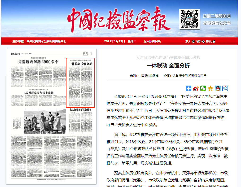 落实主体责任没有例外。在本次考核中,天津将市级党群机关,市级政府部门党组(党委),市级政法单位党组(党委)全部纳入考核范围。同时,为避免监管缺位,对市管国有企业、市属高校和其他市管单位党委(党组)的考核,分别由市国资委党委、市委教育工委等归口管理单位组织实施,实现市管单位考核全覆盖。