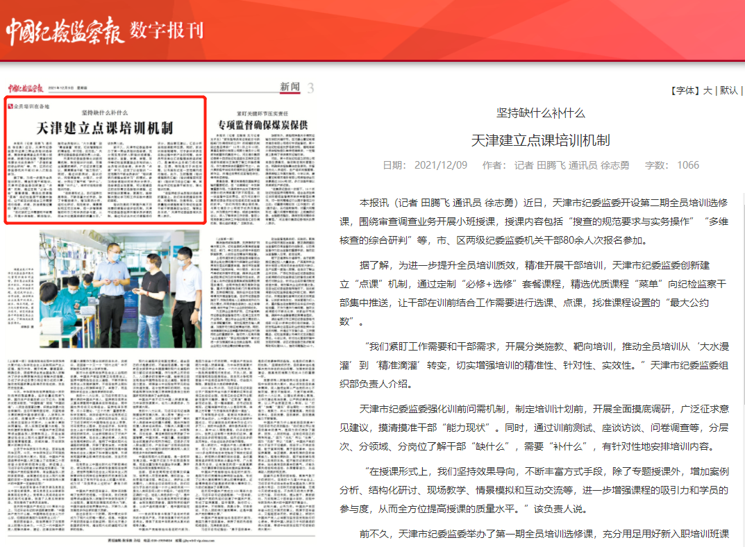 据了解,为进一步提升全员培训质效,精准开展干部培训,天津市纪委监委创新建立“点课”机制,通过定制“必修+选修”套餐课程,精选优质课程“菜单”向纪检监察干部集中推送,让干部在训前结合工作需要进行选课、点课,找准课程设置的“最大公约数”。