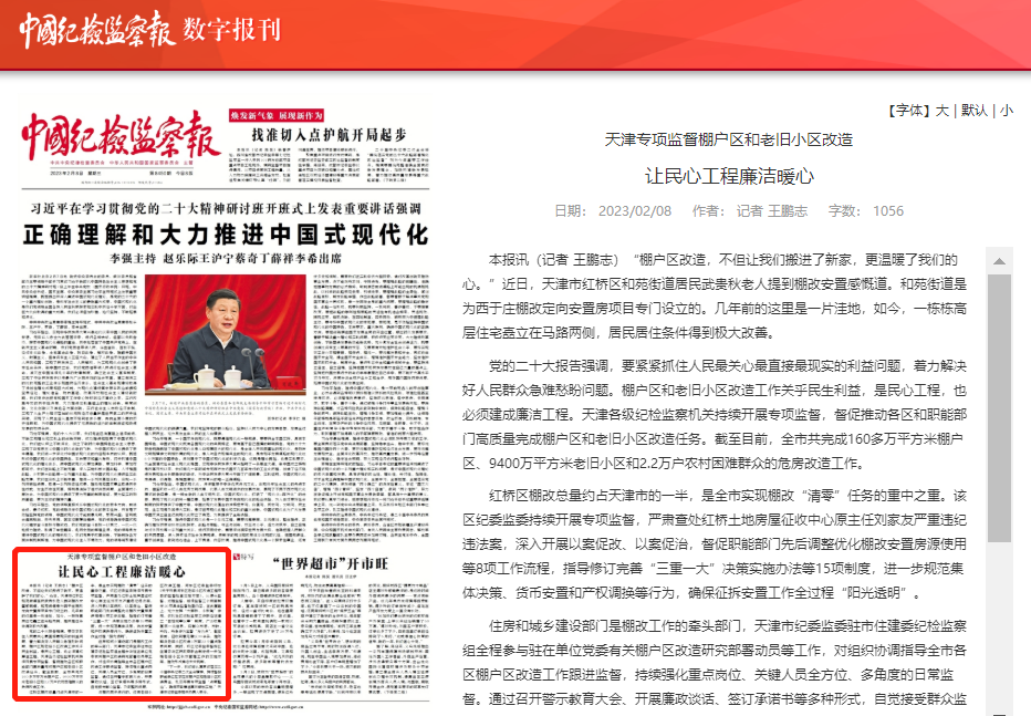 党的二十大报告强调,要紧紧抓住人民最关心最直接最现实的利益问题,着力解决好人民群众急难愁盼问题。棚户区和老旧小区改造工作关乎民生利益,是民心工程,也必须建成廉洁工程。天津各级纪检监察机关持续开展专项监督,督促推动各区和职能部门高质量完成棚户区和老旧小区改造任务。截至目前,全市共完成160多万平方米棚户区、9400万平方米老旧小区和2.2万户农村困难群众的危房改造工作。
