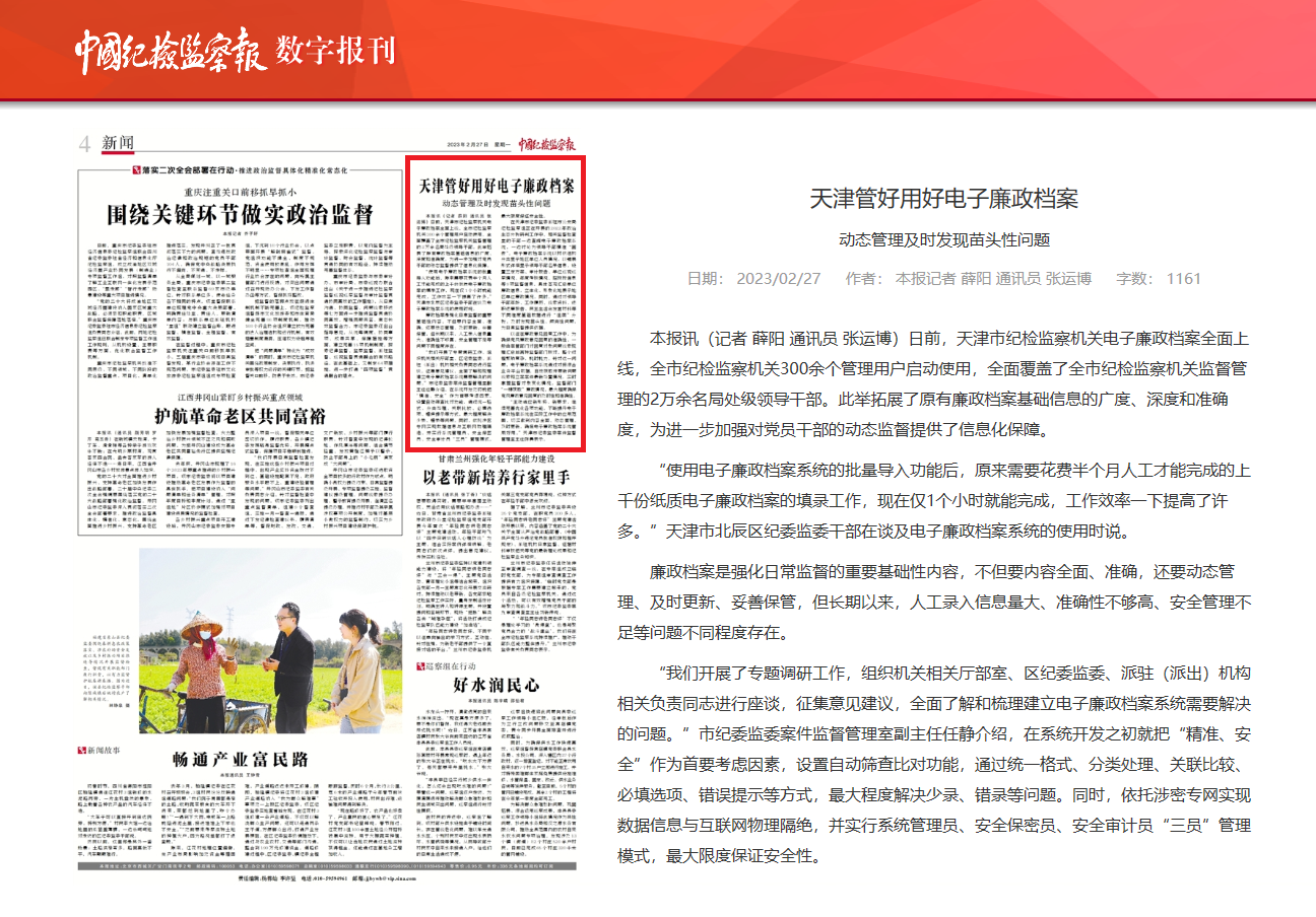 “使用电子廉政档案系统的批量导入功能后,原来需要花费半个月人工才能完成的上千份纸质电子廉政档案的填录工作,现在仅1个小时就能完成,工作效率一下提高了许多。”天津市北辰区纪委监委干部在谈及电子廉政档案系统的使用时说。