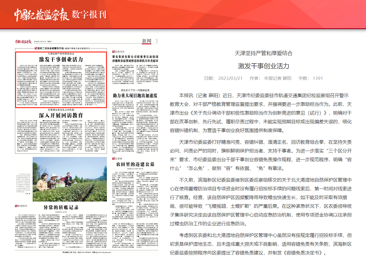 近日,天津市纪委监委驻市轨道交通集团纪检监察组召开警示教育大会,对干部严格教育管理监督提出要求,并强调要进一步激励担当作为。此前,天津市出台《关于充分调动干部积极性激励担当作为创新竞进的意见(试行)》,明确对干部在改革创新、先行先试、履职尽责过程中,未能实现预期目标或出现偏差失误的,细化容错纠错机制,为营造干事创业良好氛围提供制度保障。
