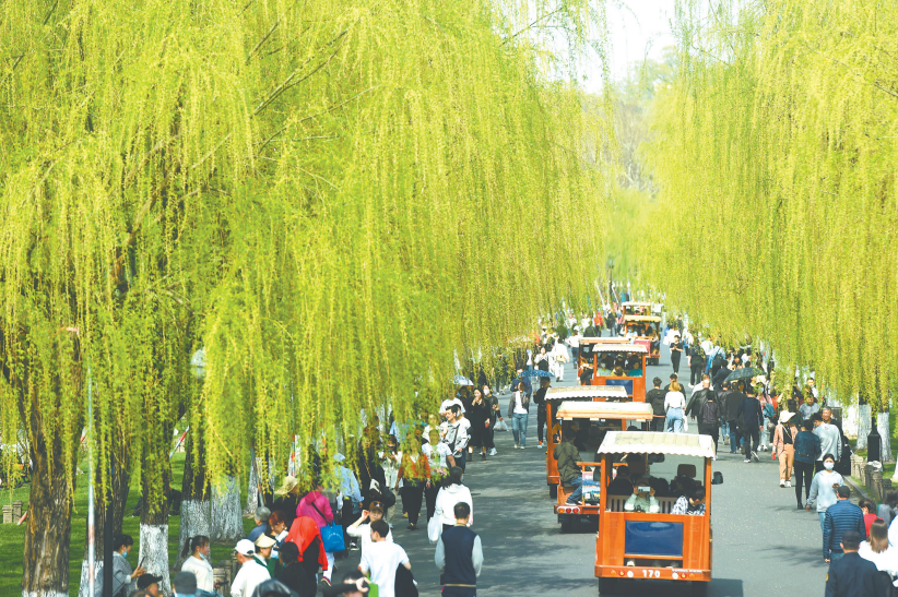 近日,浙江省杭州市西湖白堤杨柳依依,青翠可人,游客乘坐观光车或是漫步树下,乐享春日好风光。